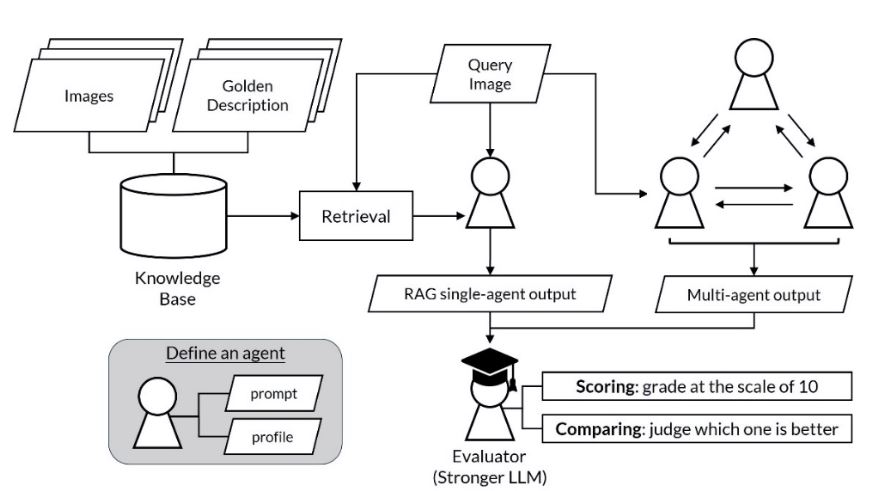 A multi-agent system based on Llama 3.2 vision model is compared to a RAG-based single-agent system based on pseudo ground-truth reports from OpenAI's GPT-4o for inspection reporting workflows: bridge inspection, building inspection, indoor progress reporting, outdoor progress reporting, and facility management inspection.